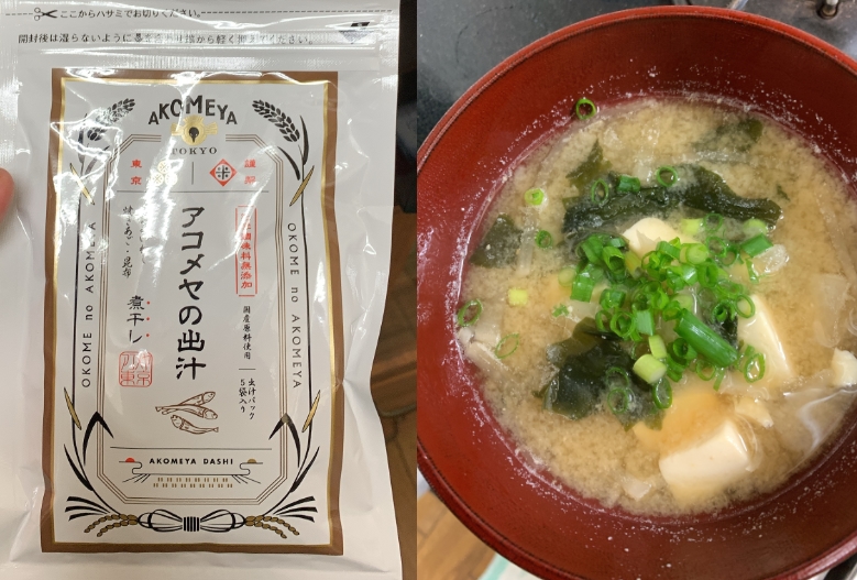 「AKOMEYAの煮干しダシ」で味噌汁を作ると、さっぱりとしているがちゃんと風味がある味噌汁が出来上がる。